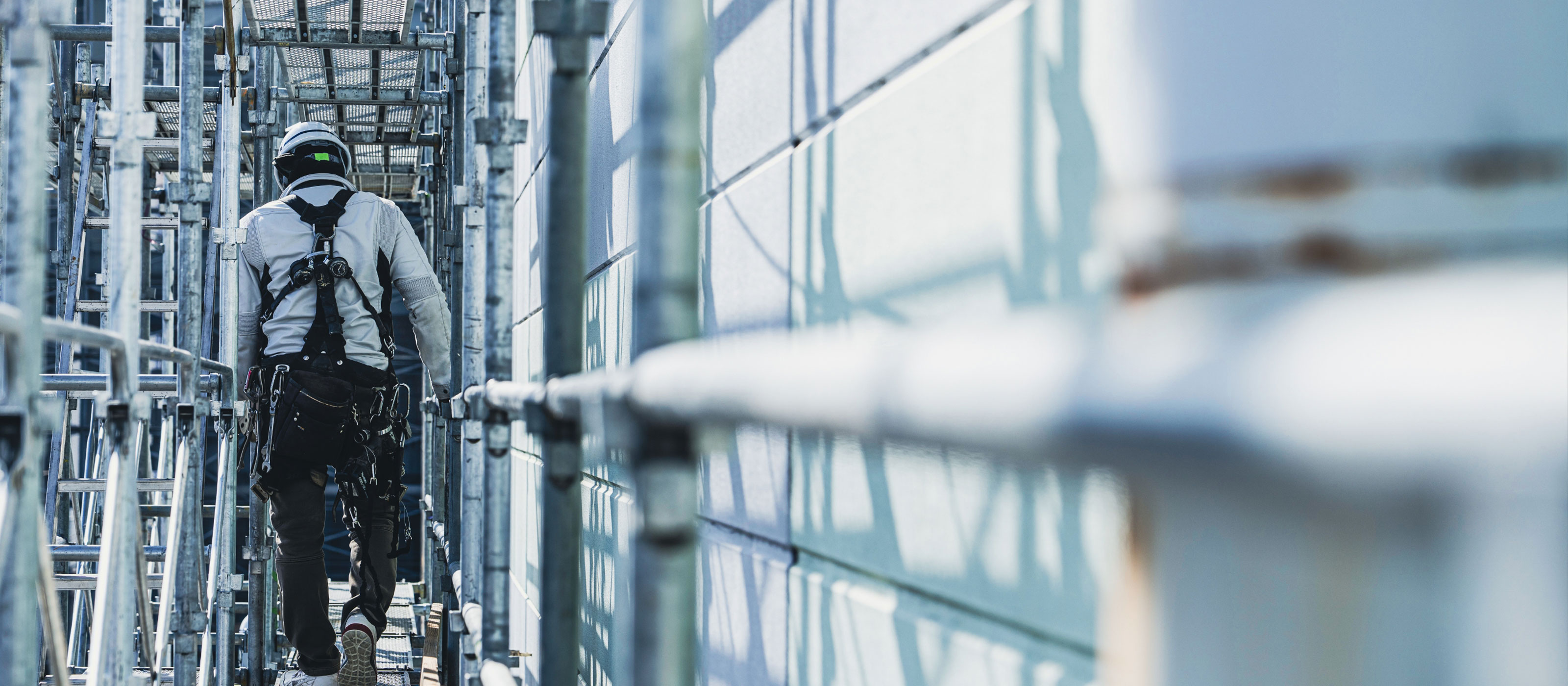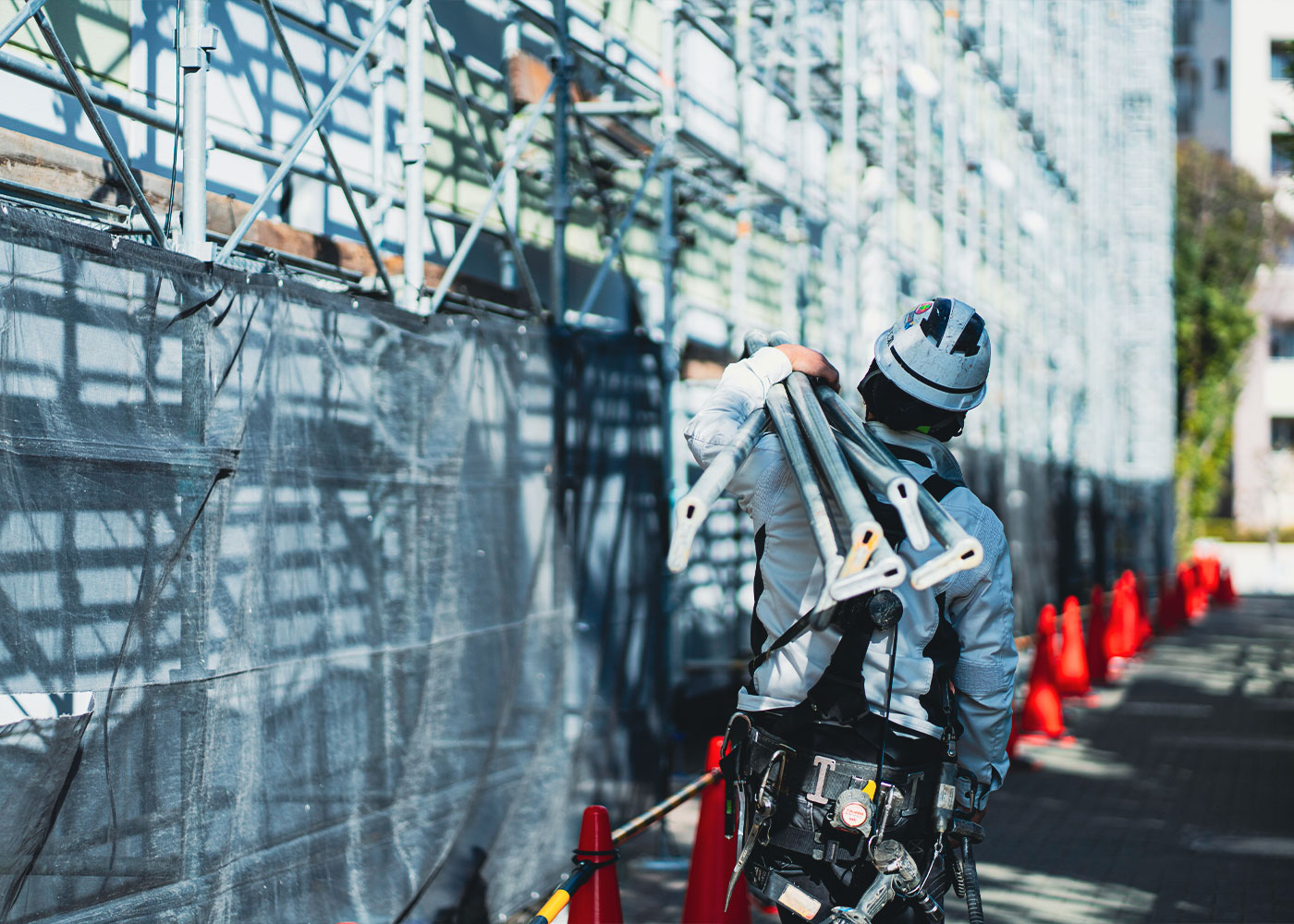 足場工事とは、建築現場や工事現場で作業員が安全に作業できるように、鉄パイプや足場板を組み立てて作業スペースを作る仕事です。建物の新築・改修・解体など、さまざまな現場で必要とされる重要な役割を担います。